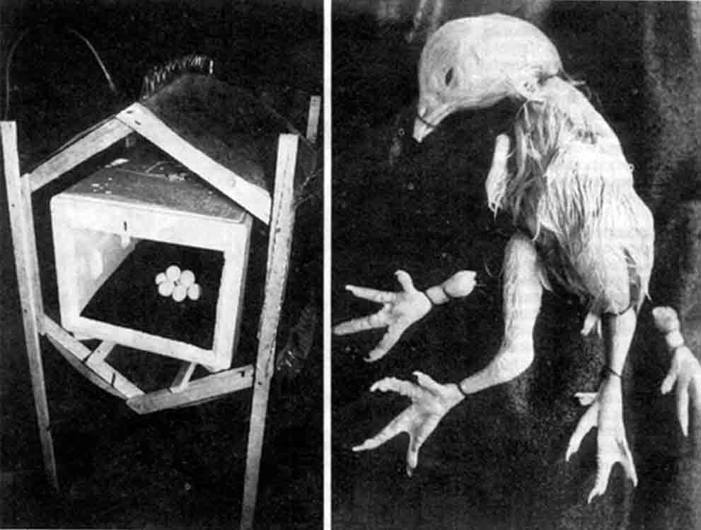 В 1990 году доктору Цзяну Каньчжен (из Китая перебравшемуся в СССР) в рамках придуманной им теории управления биополями удалось получить патенты на несколько изобретений. Среди них – устройство «Биотрон‑Цзян», способное якобы считывать информацию ДНК с одного живого объекта и передавать её другому объекту. На самом деле – это две ёмкости, соединённые трубой (волноводом), по которой излучения биополя (предположительно электромагнитной природы) сформировавшегося (взрослого) живого и здорового объекта транслируются на развивающийся зародыш (эмбрион), либо на больной объект в другой ёмкости. На этом устройстве доктор Цзян сумел воздействовать на процессы формирования зародыша кукурузы и эмбриона цыплёнка, то есть на морфогенетические поля развивающегося организма (см. рис. 3‑5).