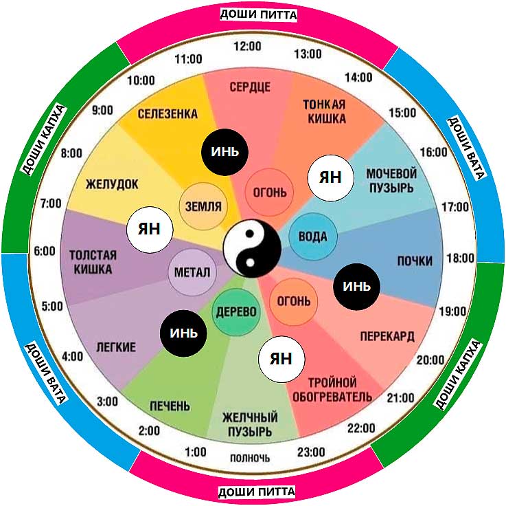 Помимо цикличности течения энергии «Ци» по меридианам можно отметить цикличность трёх Дош («Вата», «Питта» и «Капха»), учение о которых изложено в Аюрведе. Доши являются сочетанием первоэлементов в индийской традиции:
