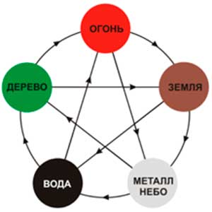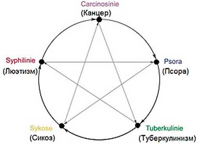 Как это ни странно, но гомеопаты «открыли» цикл «У‑Син» взаимодействия энергий «Ци», несущих разные свойства первоэлементов, только подставили вместо их названий наименования миазмов (см. рис. 3‑11).